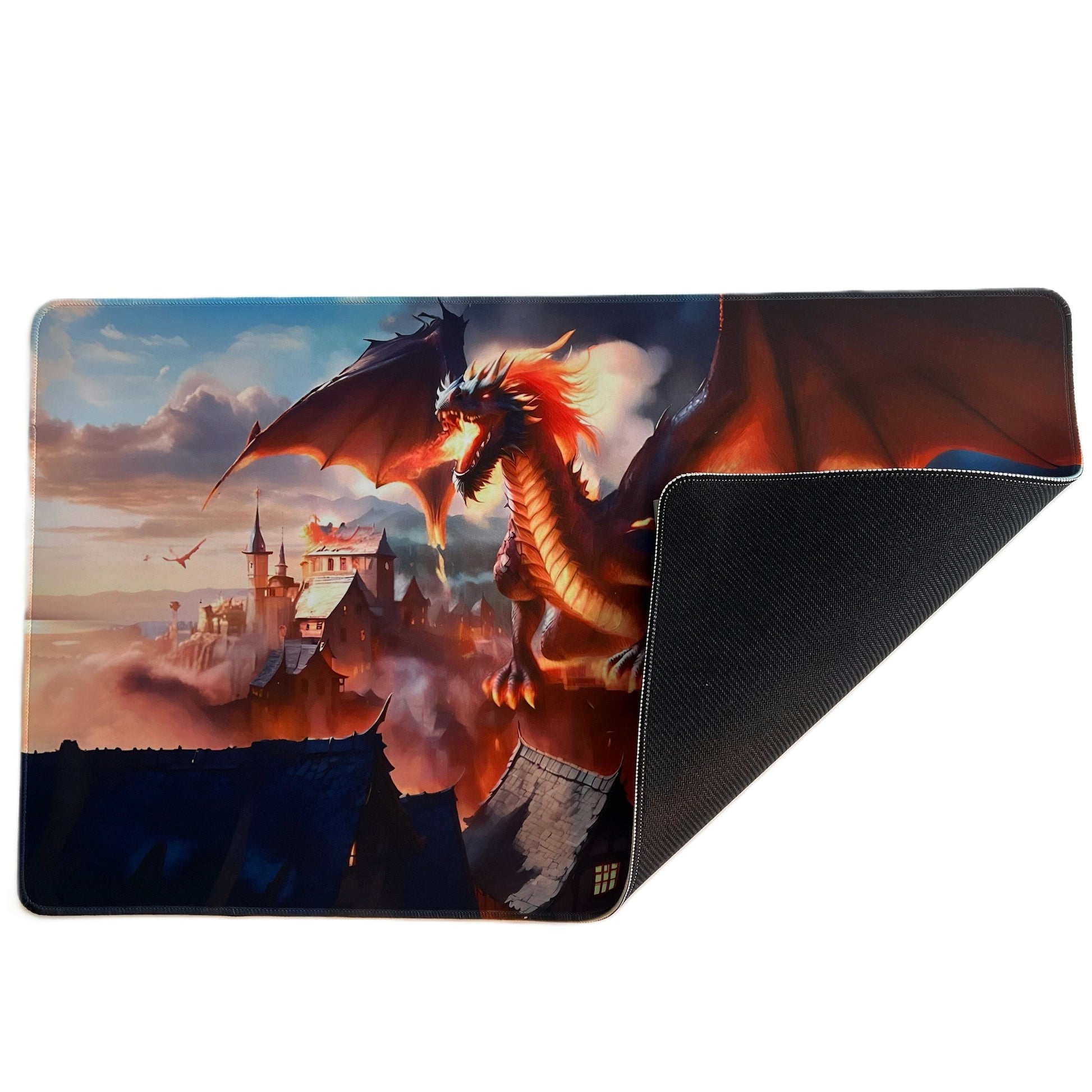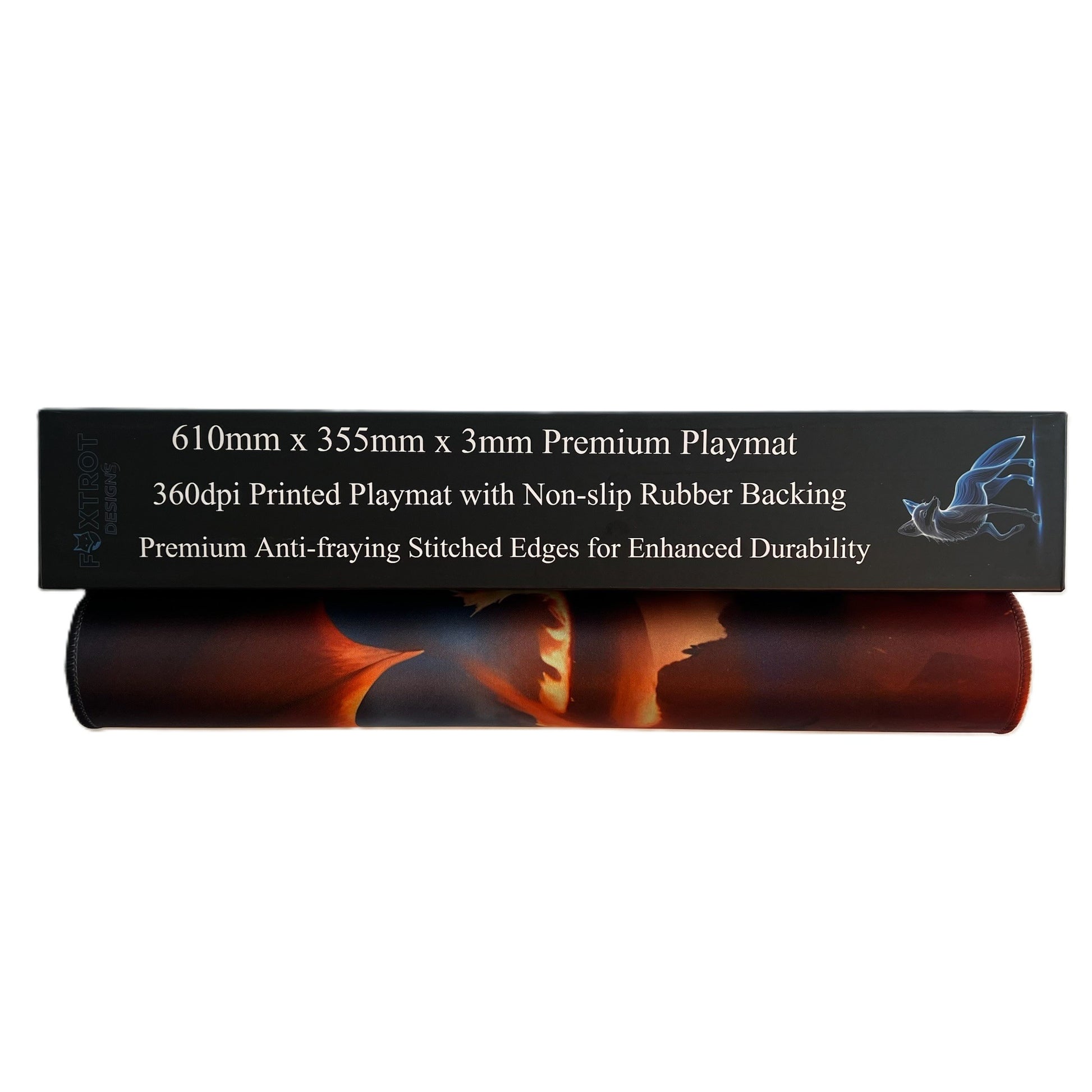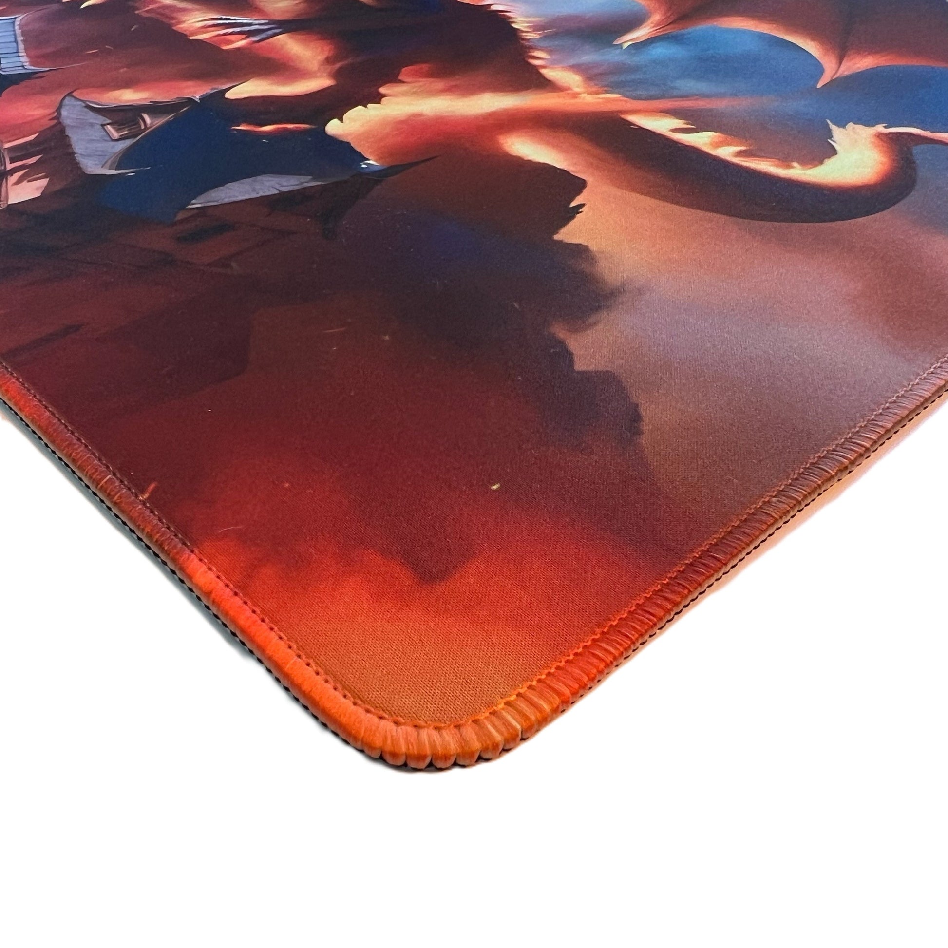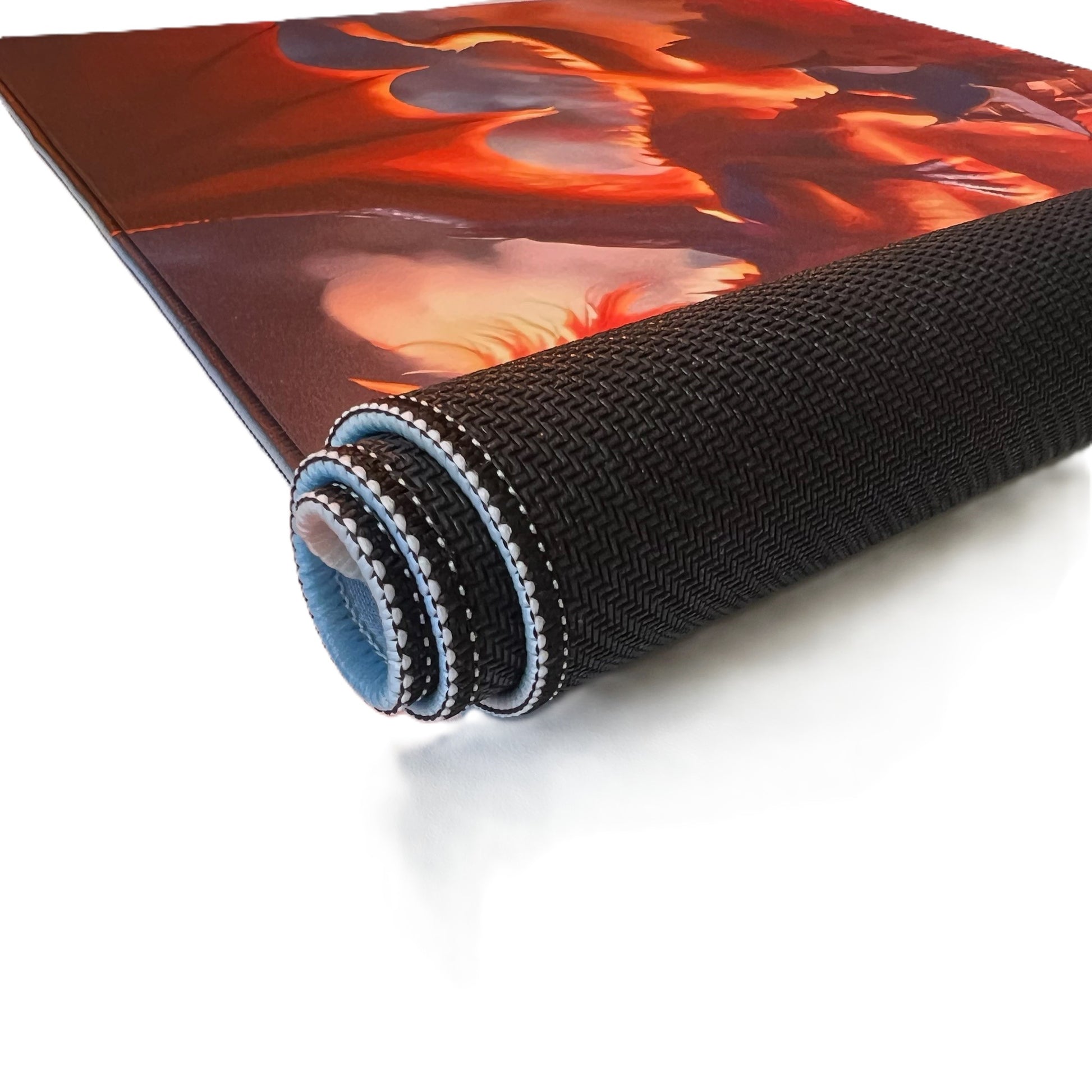 24"x14" premium playmat. 3mm thick. Non-slip rubber backing and anti-fray edge stitching.
